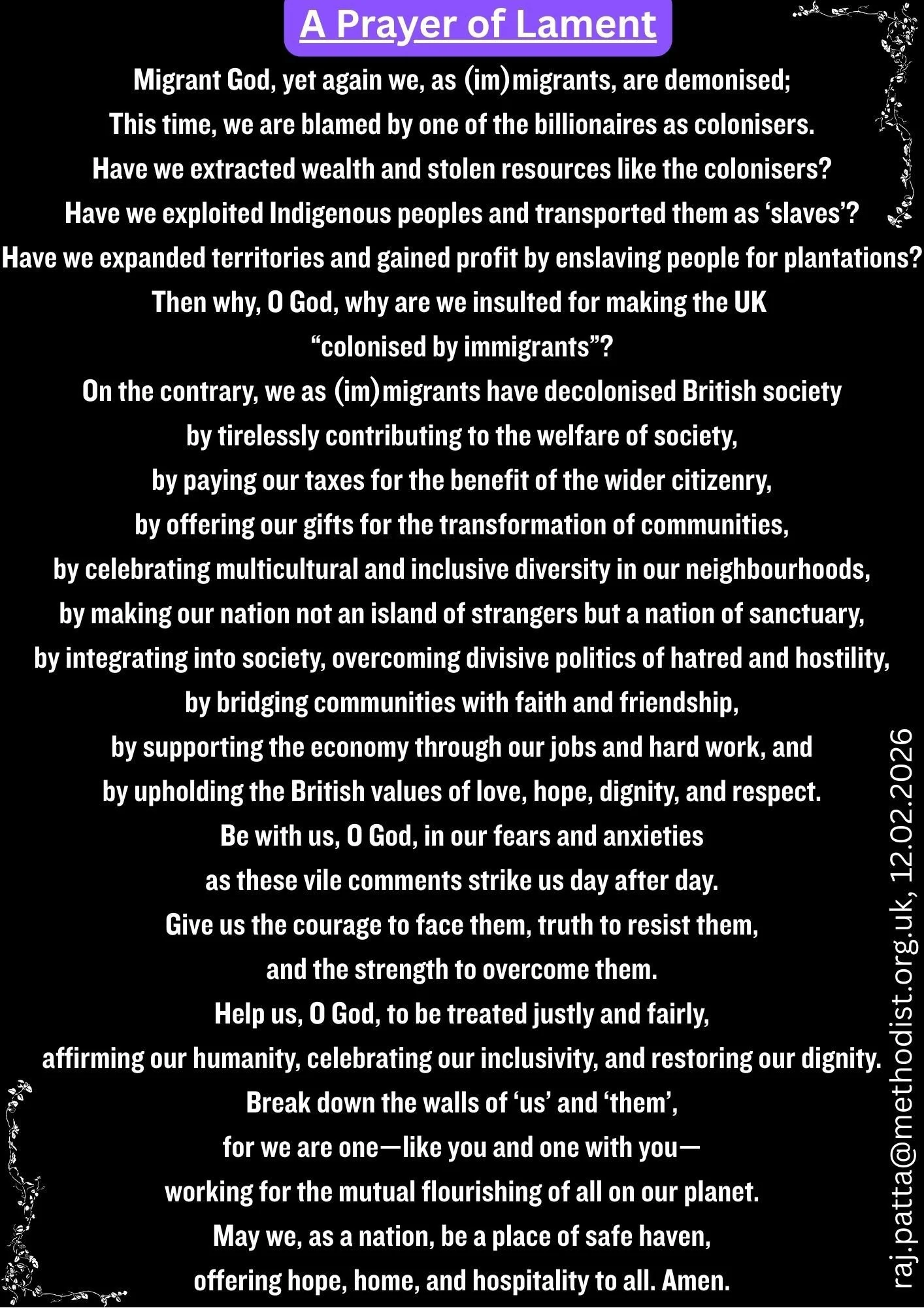Rev'd Dr Raj Bharat Patta is a Methodist minister at the United Stockport Circuit with a pastoral charge of Dialstone Lane Methodist Church and Davenport Methodist Church. He wrote this prayer of lament in response to the comment about UK as “colonised by immigrants”. God in your mercy hear our prayers. @rajpatta